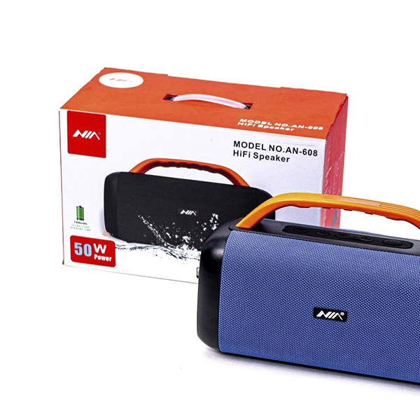 PARLANTE NIA AN-608 / ULTRA BASS / BLUETOOTH / POTENCIA 50W / USB / RADIO FM / MP3 / HANDS FREE / BATERIA 7200 MAH / AZUL / PRODUCTO NO SUMERGIBLE, RESISTE SOLO SALPICADORAS