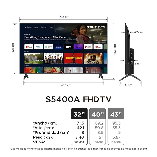 TELEVISOR TCL 43S5400A / LED 43 FHD / HDR / SMART TV / GOOGLE TV / WIFI / BLUETOOTH / CHROMECAST / 2HDMI / 1USB / RJ45 / SALIDA OPTICA / CONTROL COMANDO DE VOZ / METALLIC BEZEL-LESS ANDROID TV / NEGRO / DVB-T2